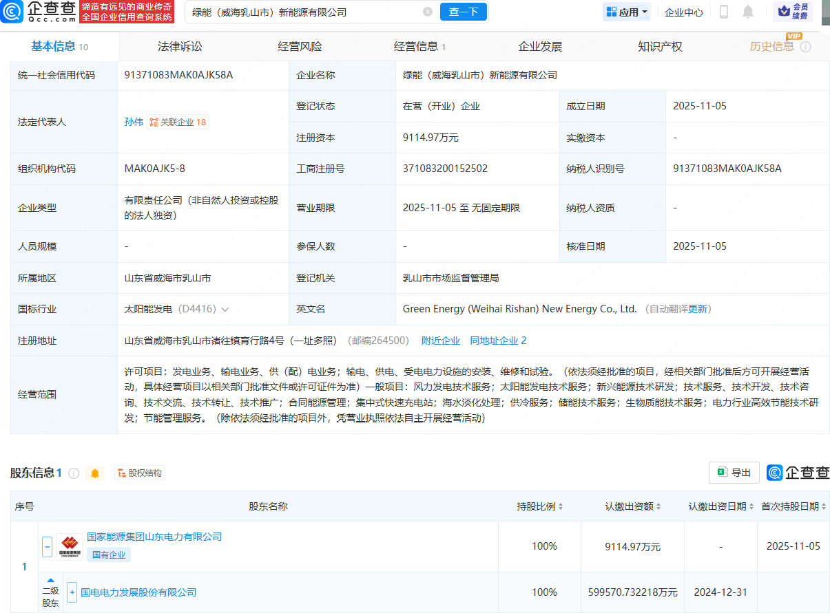 近日,绿能(威海乳山市)新能源有限公司成立,法定代表人为孙伟,注册资本为9114.97万元,经营范围包含:发电业务、输电业务、供(配)电业务;风力发电技术服务;集中式快速充电站;海水淡化处理等。企查查股权穿透显示,该公司由国电电力(600795)间接全资持股。